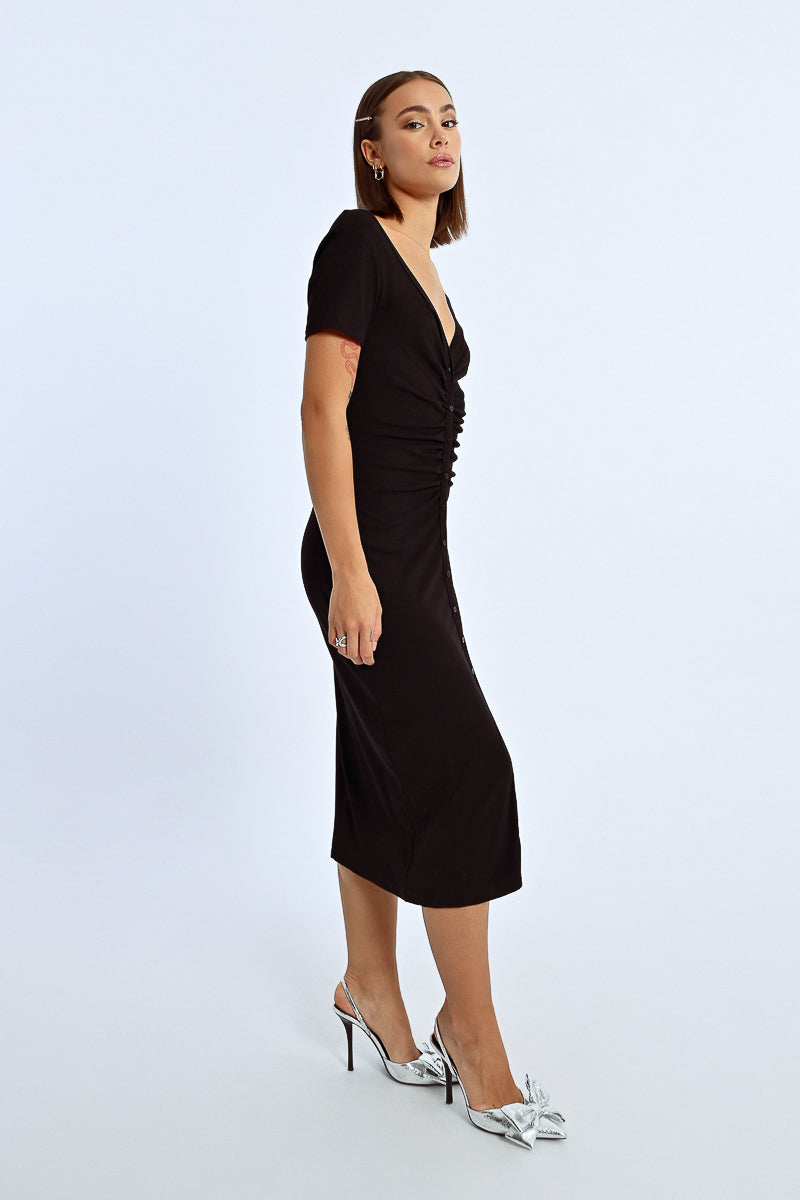 This knit v-neck button up midi dress is a versatile and classic addition to any wardrobe. With a flattering silhouette, it can easily be dressed up or down for any occasion.