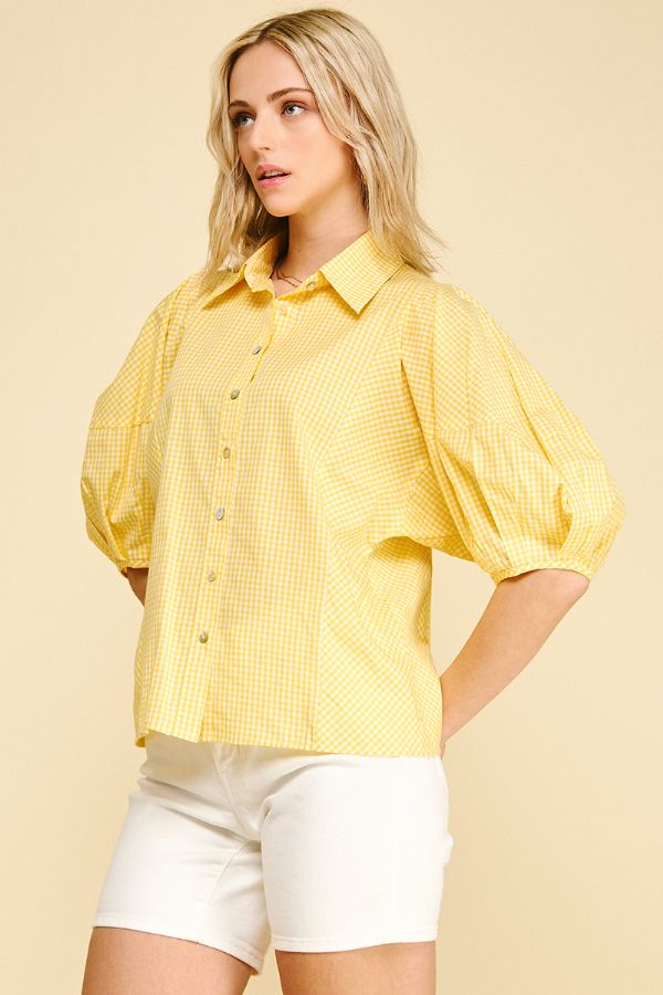 A timeless print with a stylish twist! This gingham button down top features a classic collar and button-front design for that polished, put-together look. Soft balloon sleeves and delicate pleated details add just the right amount of charm and femininity. Easy to dress up or down, it pairs perfectly with denim for a cute everyday outfit or with trousers for a more elevated style. A fresh take on a classic pattern you’ll love wearing all season long.